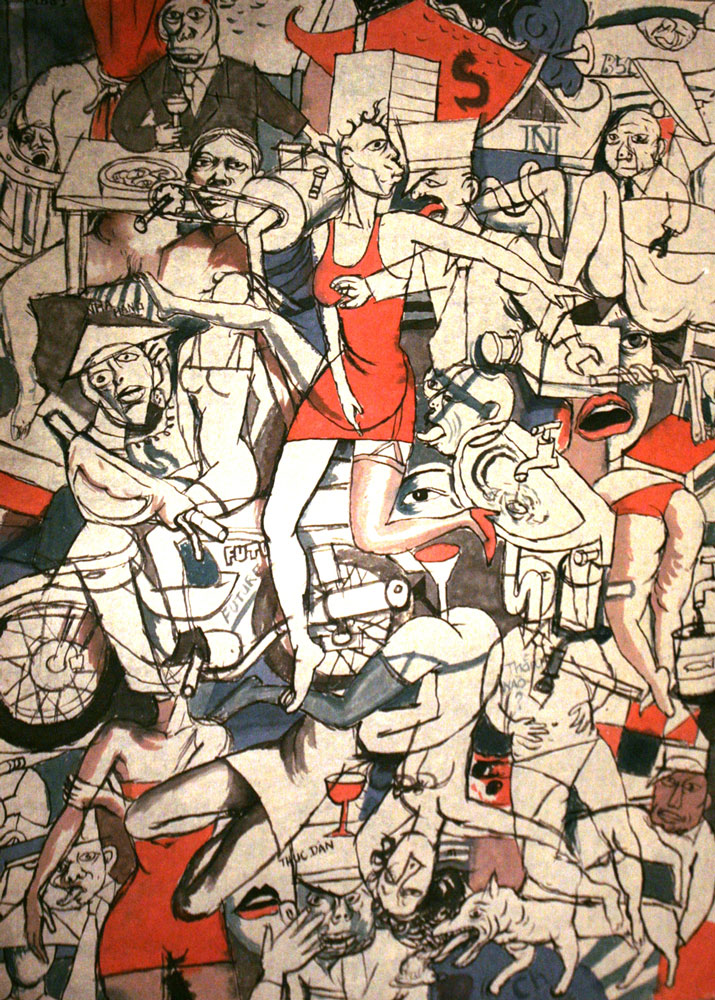 Nguyen Van Cuong belongs to the first generation of Vietnamese avant-garde artists since early 1990s. Cuong's artworks comment on the complex forces and contradictions that have occurred with westernization in Vietnam. His works offer a social commentary that should be viewed more as global commentary. In the summer of 1998 Cuong had the only solo exhibition Pacific Bridge has hosted. For that show he painted challenging works depicting power brokers as men in suits and the powerless as nude women. Included in his vocabulary of symbols are men in suits with no mouths representing the people who have power and yet have nothing to say - the mindless bureaucrats everywhere. These characterizations spoke to the broad themes of power and corruption that are evident around the world.