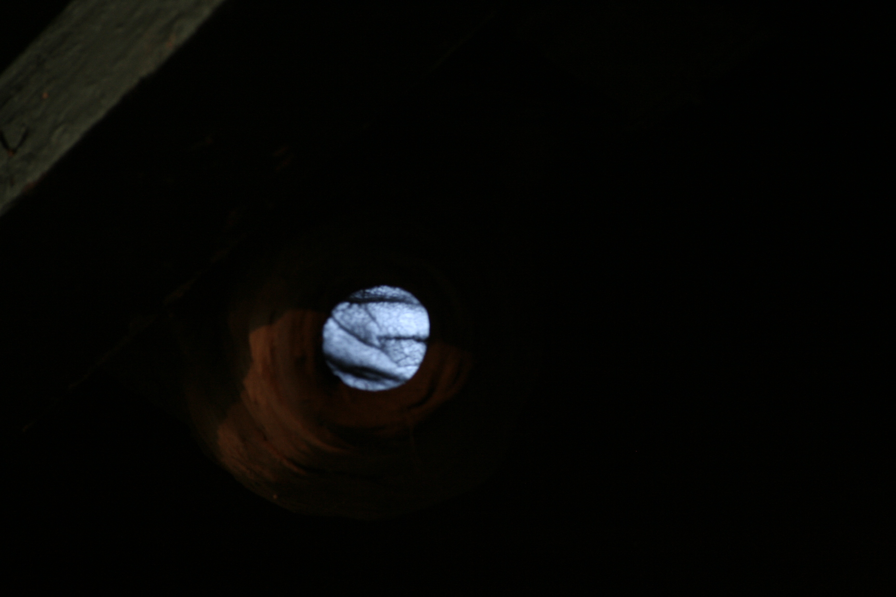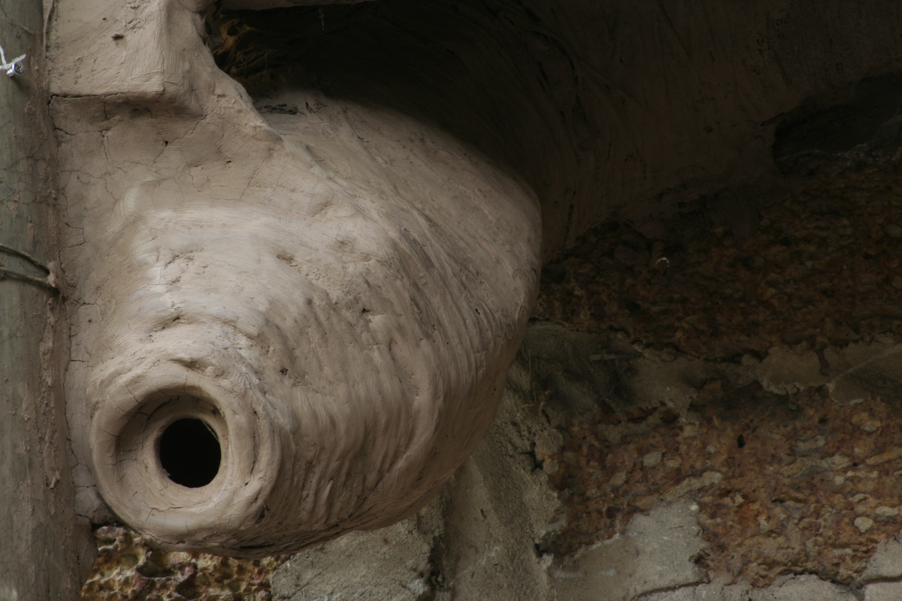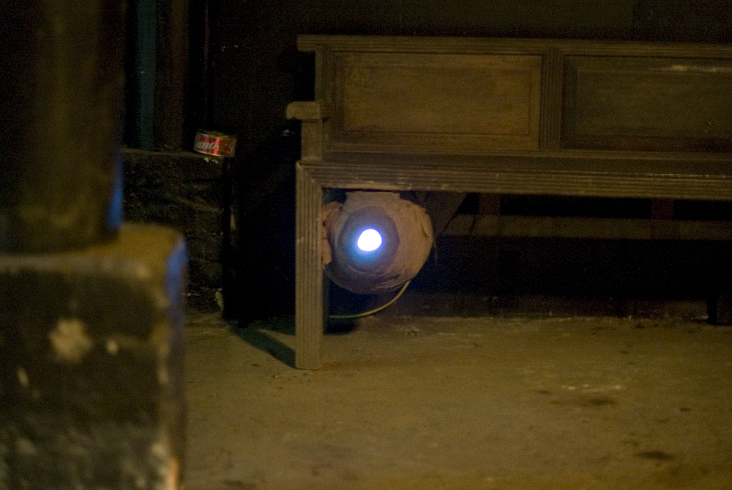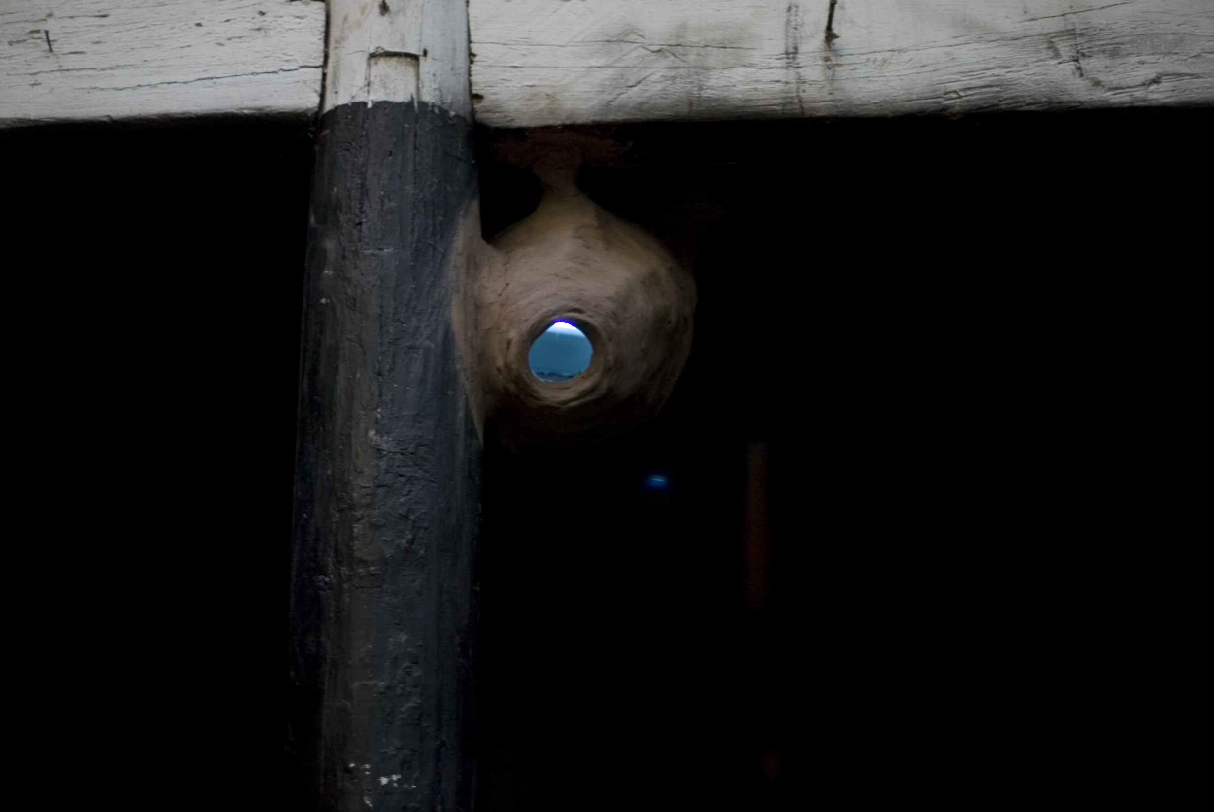 The work is comprised of a suite of fifteen sculptures. They are part mechanized creature, and part hive made from wire armatures, swathed in string and caked with a mud and paper pulp. Each hive cradles, within its bellied interior, a unique black and white video shown on a continuous loop. The hives grow from beneath the beams, projecting a dim glow in the shadowed corners of Nhasan.